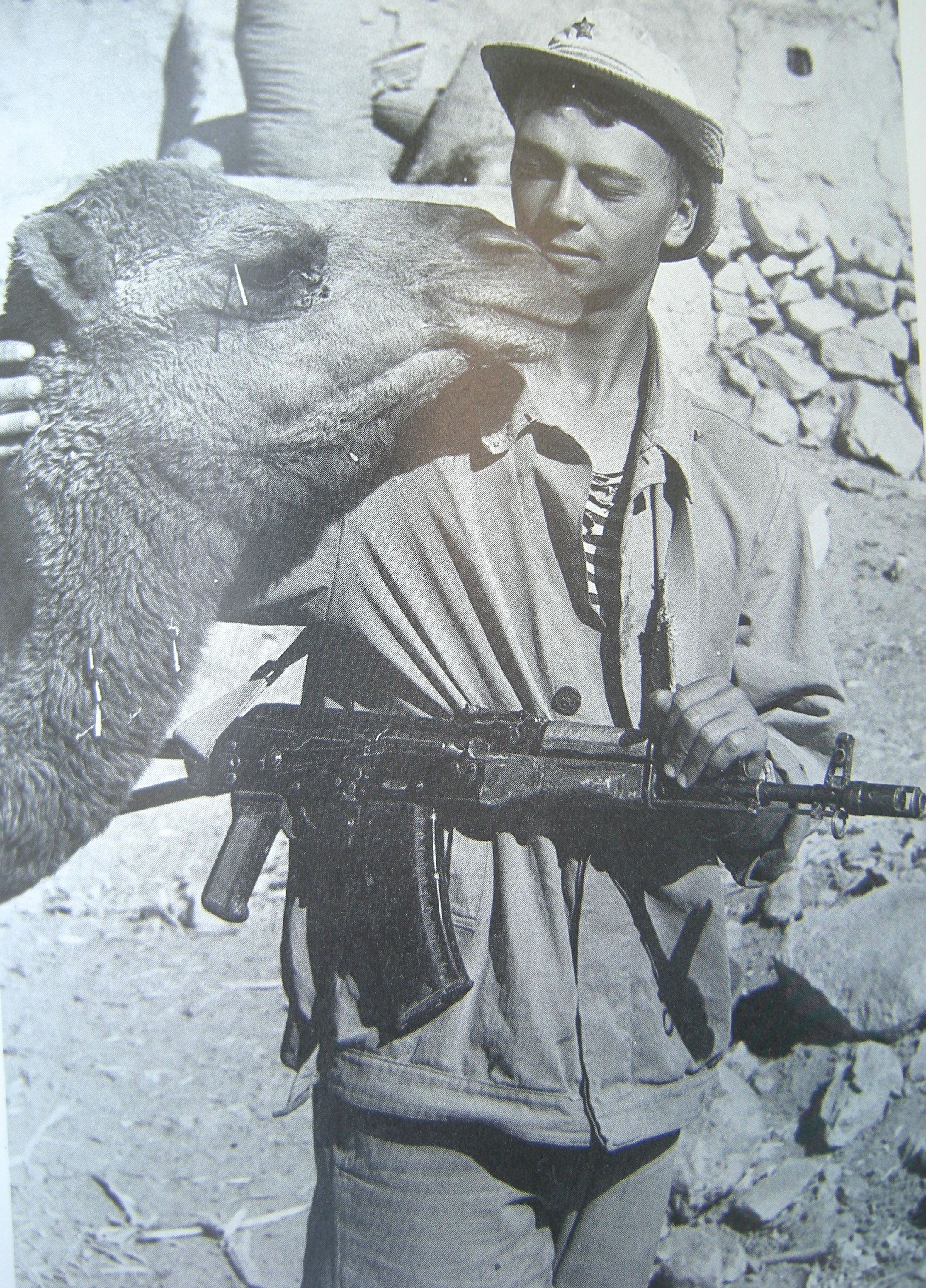 That rifle he’s got slung over his shoulder is an AK 74, a “modernized” version of the AK 47. There’s been at least a couple further modernizations since. At least that’s what I’ve read.