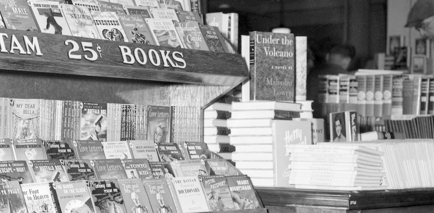 “Under the Volcano A Novel by Malcolm Lowry”. Taken at a “Bantam” book stand in Vancouver by a guy named Jack Lindsay, courtesy of the magnificent City of Vancouver Archives public domain image files.