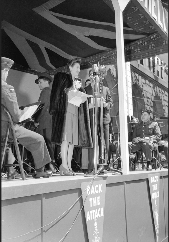 Barbara Stanwyck 1942. Hollywood star. War effort again. “Back The Attack” war bonds drive. It looks to have been a fine sunny day. I can just hear that band. Hit it!